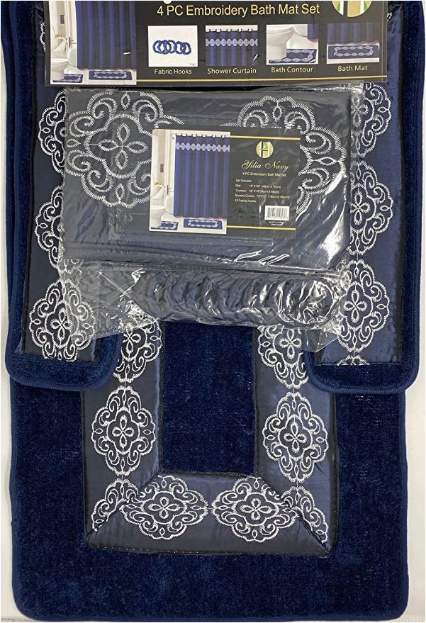 4 piece bathroom rugs set non slip navy blue print bath rug toilet contour mat with fabric shower curtain and matching rings yila navy from navy blue contour bath rug